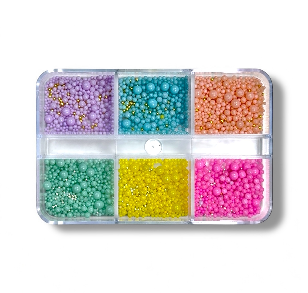 This vibrant 6-compartment box includes microbeads in pastel shades of purple, turquoise, coral, mint, yellow, and pink – perfect for trendy, playful, and 3D nail designs.